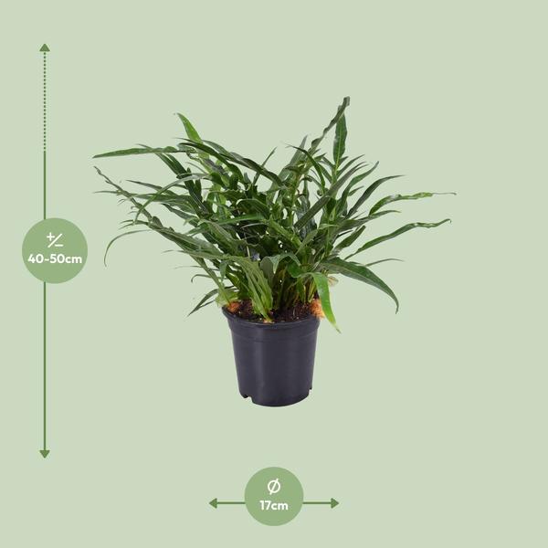 Aglaomorpha coronans, ook wel de Santa Rosa-varen genoemd, is een prachtige kamerplant die afkomstig is uit tropische regio's. De weelderige groene bladeren hangen elegant naar beneden en voegen natuurlijke schoonheid en sereniteit toe aan elke leefruimte. Met zijn vermogen om te gedijen in omgevingen met weinig licht, is deze kamerplant ideaal voor mensen die op zoek zijn naar een onderhoudsarme, maar toch prachtige plant voor in huis. Voeg een vredige sfeer toe aan je huis of kantoor met de Aglaomorpha coronans, die moeiteloos elke hoek verfraait terwijl de lucht gezuiverd wordt. Ervaar vandaag nog de aantrekkingskracht van de Santa Rosa-varen en breng de natuur binnenshuis! Ben je op zoek naar een prachtige toevoeging aan je binnentuin? Zoek niet verder dan de Aglaomorpha coronans! Met zijn levendige bladeren en unieke textuur is deze plant een echte blikvanger. Om hem gelukkig en gezond te houden, plaats je hem op een plek met halfschaduw, aangezien hij het goed doet in half beschaduwde gebieden. Vergeet niet om hem eens per week water te geven en ervoor te zorgen dat de grond gelijkmatig vochtig is. Met minimaal onderhoud wordt deze Aglaomorpha coronans de eyecatcher van je ruimte. Voeg een vleugje natuur toe aan je huis met deze onderhoudsvriendelijke schoonheid!Wist je dat Aglaomorpha coronans, ook bekend als de konijnenpootvaren, unieke harige wortelstokken heeft die lijken op de harige voeten van een konijn? Schattig, toch? Deze tropische en exotische plant is populair onder tuiniers vanwege zijn aantrekkelijke bladeren en gemakkelijke verzorging. Hou er echter rekening mee dat hoewel deze varen je aandacht kan trekken, het strikt een decoratieve plant is en niet bedoeld is voor consumptie. Dus, zorg ervoor dat je harige vrienden niet knabbelen aan deze pluizige schoonheid!Aglaomorpha coronans, ook wel bekend als de Santa Rosa-varen, is een populaire kamerplant.Deze varen heeft een potmaat van 17 cm, waardoor hij geschikt is voor kleinere ruimtes of als decoratieve toevoeging aan elke kamer.Met een hoogte van ongeveer 45 cm voegt Aglaomorpha coronans een vleugje elegantie toe met zijn vederachtige bladeren.Hij gedijt goed in halfschaduw, waardoor het een ideale keuze is voor plekken in uw huis met indirect zonlicht of in de schaduw van andere planten.Leuk feitje: De bladeren van Aglaomorpha coronans zijn delicaat en vaak licht golvend, waardoor deze varen een unieke en gracieuze uitstraling heeft.