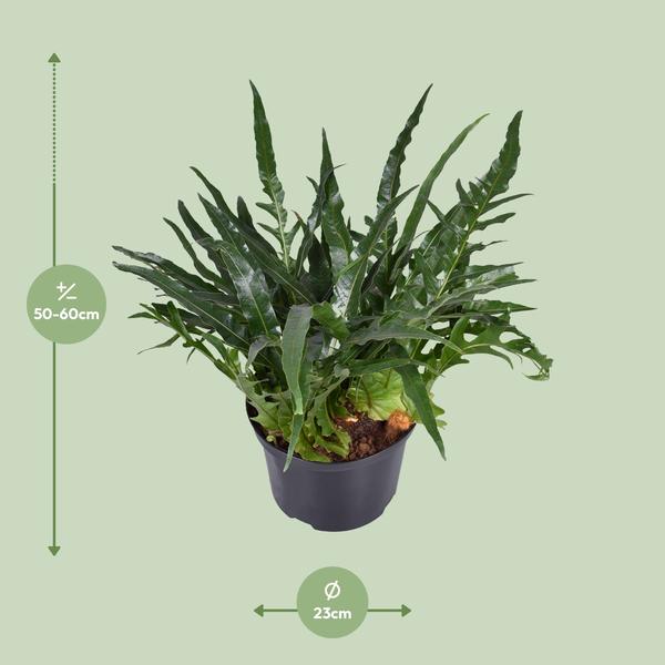 Ontdek de betoverende Aglaomorpha coronans, een fascinerende kamerplant die een vleugje natuurlijke charme toevoegt aan elke ruimte. Ook bekend als de Santa Rosa-varen, komt dit prachtige exemplaar oorspronkelijk uit tropische gebieden en gedijt het goed bij gematigde lichtomstandigheden. Zijn elegant gebogen bladeren, versierd met delicate groene bladeren, creëren een betoverende presentatie. Met zijn gemakkelijke verzorging is de Aglaomorpha coronans perfect voor zowel ervaren plantenliefhebbers als beginners. Breng de aantrekkingskracht van de Santa Rosa-varen in huis en dompel jezelf onder in de rust die het moeiteloos uitstraalt. Maak kennis met de prachtige Aglaomorpha coronans, een mooie plant die elke ruimte een vleugje elegantie kan geven! Deze unieke bladplant gedijt het beste op een plek met gedeeltelijke schaduw, waardoor het een ideale toevoeging is aan elke binnen tuin. Met zijn gemakkelijke onderhoud heeft deze plant slechts één keer per week water nodig, waardoor het onderhoud een fluitje van een cent is. Zijn levendige bladeren en compacte formaat maken het een veelzijdige keuze voor verschillende instellingen. Verhoog moeiteloos uw interieurdecor met de Aglaomorpha coronans, een onderhoudsarme plant met een hoog esthetisch aantrekkingskracht. Bestel nu en transformeer uw ruimte met deze betoverende schoonheid!Wist je dat Aglaomorpha coronans, ook bekend als de Hertenpootvaren, een populaire keuze is voor liefhebbers van groen die hun huizen willen versieren? Met zijn weelderige, delicate bladeren die op hertenhoeven lijken, voegt deze plant een vleugje elegantie toe aan elke ruimte. Het is echter essentieel om op te merken dat, hoewel Hertenpootvarens fascinerend zijn, ze niet bedoeld zijn voor consumptie. Geniet dus van de schoonheid van deze plant, maar laat het knabbelen over aan andere eetbare verrassingen!- Aglaomorpha coronans heeft een potmaat van 23 cm en bereikt een hoogte van ongeveer 60 cm.- Deze plant staat ook bekend als de Santa Rosa Varen en voegt een elegante touch toe aan elke binnen- of buitenruimte.- Aglaomorpha coronans geeft de voorkeur aan een plek in halfschaduw, waardoor het een ideale keuze is voor gebieden met indirect zonlicht.- Een interessant feit over Aglaomorpha is zijn vermogen om schadelijke toxines uit de lucht te verwijderen, waardoor de luchtkwaliteit in uw ruimte verbetert.- Met zijn aantrekkelijke bladeren en luchtzuiverende eigenschappen is Aglaomorpha coronans een populaire keuze onder plantenliefhebbers en een geweldige toevoeging aan elke groene ruimte.