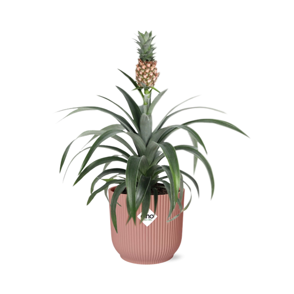 De ananasplant is inheems in de tropische regio's van Zuid-Amerika, vooral Brazilië en Paraguay. Het gedijt in warme en vochtige klimaten, waardoor het een perfecte kamerplant is voor mensen die in soortgelijke omstandigheden leven. De ananasplant kan tot 3 voet hoog groeien en heeft indirect zonlicht en goed doorlatende grond nodig. Met de juiste verzorging en aandacht kan het in ongeveer twee jaar kleine eetbare vruchten produceren. Dus, als je een vleugje tropische sfeer aan je binnenruimte wilt toevoegen terwijl je geniet van de voordelen van schone lucht, is de ananasplant een perfecte keuze.