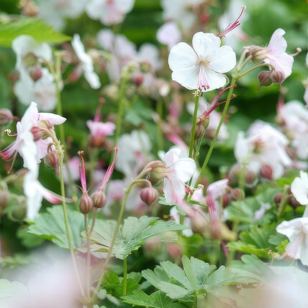 De **Geranium cantabrigiense 'Biokovo'** is een laagblijvende bodembedekker (10-15 cm) die in mei en juni sierlijke wit-roze bloemen geeft. Deze onderhoudsvriendelijke plant groeit op vrijwel elke grondsoort en verspreidt zich via wortelscheuten. Ideaal voor borders, randen of als bodembedekking. Snoeien is niet nodig!