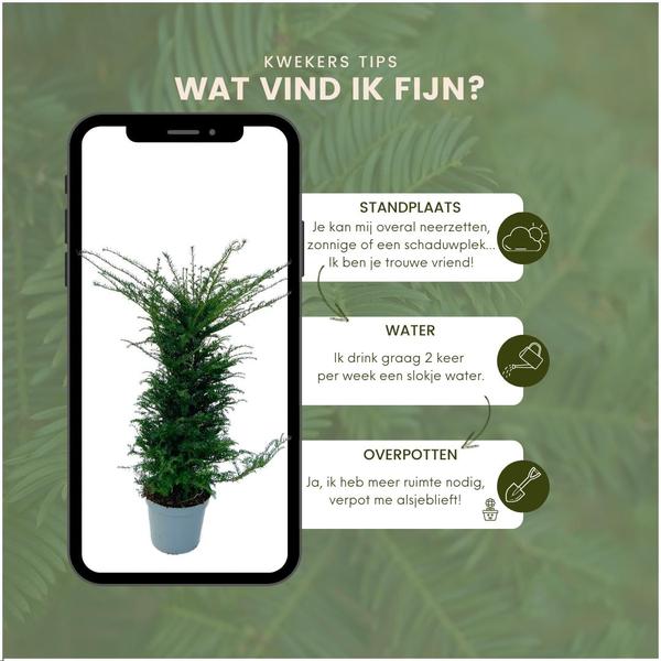 De Taxus 'Baccata', ook bekend als de Venijnboom, is een zeer gewaardeerde conifeer die bekend staat om zijn dichte, donkergroene bladeren en klassieke kegelvormige silhouet. Het is een uitstekende keuze voor zowel formele als informele tuinontwerpen en biedt het hele jaar door interesse en structuur.