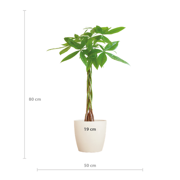 De Pachira Aquatica (Geldboom) is een makkelijke, mooie kamerplant. Met zijn gevlochten stam is het een vrolijk miniboompje, waar je jarenlang van kunt genieten. Je herkent de Pachira Aquatica aan zijn glimmende, vijfdelige bladeren. In het Verre Oosten is de Pachira het middelpunt van een interessante mythe. Namelijk, dat deze plant geld aantrekt. Dit zou hij opvangen met zijn bladeren, die met een beetje fantasie op een soort groene handen lijken. Om deze reden wordt de kamerplant ook wel geldboom genoemd. Of dit nu wel of niet klopt, de Pachira Aquatica maakt je altijd rijker. Met zijn frisgroene bladeren en sierlijk gevlochten stam is deze kamerplant namelijk een echte verrijking van jouw interieur.