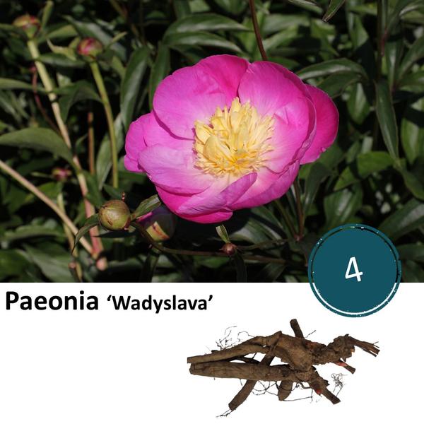 **Paeonia 'Wadyslava'** is een prachtige pioenroos met elegante bloemen in een zachte, lichtroze kleur. De bloemen bloeien rijkelijk van mei tot juni en kunnen tot 12 cm in diameter groeien. Deze plant bereikt een hoogte van ongeveer 80 cm, perfect voor borders en bloemperken. Geleverd als blote wortel met 3 tot 5 neuzen, klaar om te bloeien in jouw tuin!