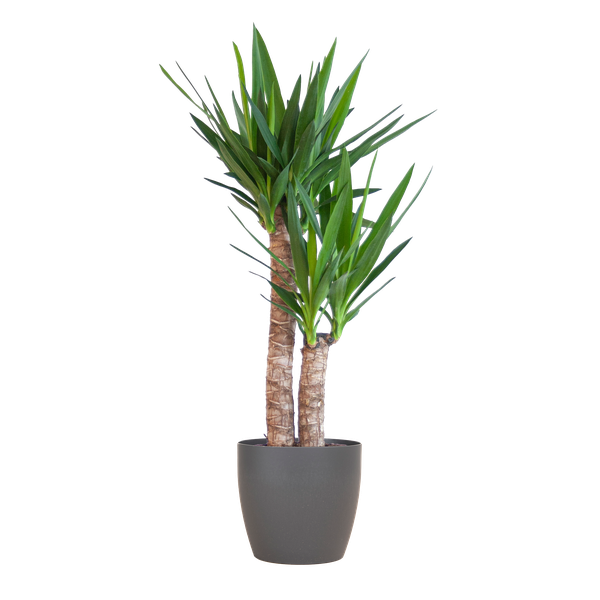 De Yucca, ook wel bekend als Palmlelie, is een indrukwekkende groene kamerplant met lange, stevige, zwaardvormige bladeren. Deze bladeren geven de plant een stoere en robuuste uitstraling, waardoor hij een echte blikvanger is in elk interieur.