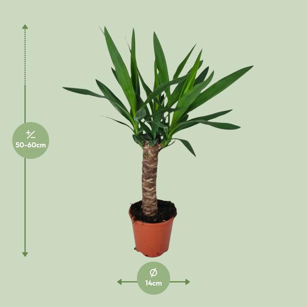 Yucca is een populaire kamerplant die bekend staat om zijn opvallende uiterlijk en luchtzuiverende eigenschappen. Oorspronkelijk afkomstig uit hete en droge regio's van Noord- en Midden-Amerika, kan Yucca zowel binnen als buiten gedijen. Het is vaak te vinden in woestijnachtige omgevingen met zanderige of rotsachtige grond. In zijn natuurlijke habitat kan Yucca extreme temperaturen en droge omstandigheden doorstaan, waardoor het een veerkrachtige plant is. Als kamerplant heeft Yucca helder indirect licht en goed doorlatende grond nodig. Het is een onderhoudsarme plant die zich kan aanpassen aan verschillende binnenomgevingen. Bovendien staat Yucca bekend om zijn luchtzuiverende vermogen. Het filtert effectief schadelijke gifstoffen, zoals formaldehyde en benzeen, uit de lucht, waardoor de binnenluchtkwaliteit verbetert. Met zijn unieke architectonische vorm en luchtzuiverende eigenschappen is Yucca een perfecte toevoeging aan elke binnenruimte. Yucca planten gedijen goed op een plek met halfschaduw en hebben eens in de 8-10 dagen water nodig. Ze geven de voorkeur aan goed doorlatende grond, dus het is ideaal om ze in zanderige of leemachtige grond te planten. Het bemesten van yucca planten moet spaarzaam gebeuren, omdat ze geen grote voedingsstoffenbehoefte hebben. Het is voldoende om elke 2-3 maanden tijdens het groeiseizoen een gebalanceerde meststof toe te dienen. Overbemesting kan leiden tot overmatige groei en zwakke planten. Onthoud dat je voorzichtig moet zijn met water geven en voeden van je yucca plant om de levensduur en vitaliteit ervan in je tuin te waarborgen. Yucca planten worden veelvuldig binnenshuis gebruikt als sierplanten vanwege hun vermogen om te gedijen in omstandigheden met weinig licht. Ze hebben hoge, stijve, zwaardvormige bladeren die een vleugje elegantie toevoegen aan elke binnenruimte, waardoor ze een populaire keuze zijn om groen en visuele interesse toe te voegen aan woningen en kantoren. - Deze Yucca plant wordt geleverd in een pot van 14 cm, perfect voor zowel binnen- als buitenruimtes. - Met een huidige hoogte van ongeveer 60 cm is deze Yucca een indrukwekkende toevoeging aan elke ruimte. - Deze Yucca gedijt goed op een plek met halfschaduw en geeft de voorkeur aan een evenwichtige hoeveelheid zonlicht en schaduw. - Makkelijk in onderhoud, deze Yucca plant vereist minimaal onderhoud en is daarom een uitstekende keuze voor drukke plantenliefhebbers. - Bekend om zijn opvallende verschijning, heeft de Yucca plant lange zwaardvormige bladeren die een vleugje elegantie toevoegen aan elke ruimte.