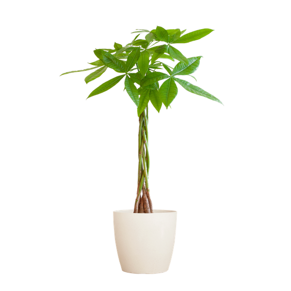 De Pachira Aquatica (Geldboom) is een makkelijke, mooie kamerplant. Met zijn gevlochten stam is het een vrolijk miniboompje, waar je jarenlang van kunt genieten. Je herkent de Pachira Aquatica aan zijn glimmende, vijfdelige bladeren. In het Verre Oosten is de Pachira het middelpunt van een interessante mythe. Namelijk, dat deze plant geld aantrekt. Dit zou hij opvangen met zijn bladeren, die met een beetje fantasie op een soort groene handen lijken. Om deze reden wordt de kamerplant ook wel geldboom genoemd. Of dit nu wel of niet klopt, de Pachira Aquatica maakt je altijd rijker. Met zijn frisgroene bladeren en sierlijk gevlochten stam is deze kamerplant namelijk een echte verrijking van jouw interieur.