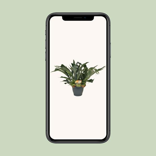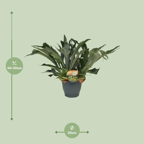 Staghorn varens zijn populaire kamerplanten die bekend staan om hun unieke gewei-achtige bladeren. Deze varens, wetenschappelijk bekend als Platycerium, zijn inheems in tropische regio's zoals Zuidoost-Azië, Australië en Afrika. Deze planten zijn epifyten, wat betekent dat ze groeien op bomen of rotsen in plaats van in de grond. Dit maakt ze perfect geschikt voor binnenomgevingen, omdat ze kunnen worden gemonteerd op een bord of opgehangen in manden zonder dat ze aarde nodig hebben. Staghorn varens gedijen in helder, indirect licht en hebben hoge luchtvochtigheid nodig om hun natuurlijke regenwoudhabitat na te bootsen. Met de juiste verzorging kunnen deze varens een prachtige toevoeging zijn aan elke binnenruimte en een vleugje tropische schoonheid toevoegen. In het wild geven Platycerium varens de voorkeur aan gebieden met veel vochtigheid en veel regenval. Hun natuurlijke habitat omvat gebieden met weelderige vegetatie, zoals regenwouden en tropische bossen. Deze gebieden bieden de perfecte omstandigheden voor de varens om te groeien en te gedijen. Ze kunnen vaak worden gevonden in de ondergroei van het bos, waar ze zich vasthechten aan bomen of rotsen. Deze varens hebben zich aangepast om voedingsstoffen en water uit de lucht, regen en vergaand materiaal om hen heen op te nemen. Hoewel ze oorspronkelijk uit tropische regio's komen, kunnen Staghorn varens met succes binnenshuis worden gekweekt in een breed scala aan klimaten, waardoor een stukje jungle in huis wordt gehaald. Platycerium, ook bekend als Varenhoorn, gedijt op een halfschaduwrijke plek en heeft om de 8-10 dagen water nodig. Deze unieke plant geeft de voorkeur aan goed doorlatende grond, zoals een mengsel van veenmos, orchideeënschors en perliet. Wat betreft bemesting is het het beste om de Varenhoorn eens in de drie tot vier weken tijdens het groeiseizoen, dat meestal in de lente en de zomer valt, met verdunde vloeibare meststof te voeden. Vermijd bemesting tijdens de rustperiode in de herfst en winter. Dit verzorgingsregime zal helpen om een gezonde en bloeiende Varenhoorn te garanderen. Staghorn varens zijn populaire kamerplanten omdat ze een unieke touch toevoegen aan elke ruimte. Hun kenmerkende bladeren lijken op het gewei van een hert, vandaar de naam, en ze kunnen op muren worden gemonteerd voor een opvallende presentatie. Bovendien gedijen ze goed in omstandigheden met weinig licht, waardoor ze perfect zijn om een vleugje groen toe te voegen aan binnenruimtes met beperkt zonlicht. Deze Geweischede zal geleverd worden in een grootte van 20 cm. De huidige hoogte van deze Geweischede is ongeveer 50 cm. Deze plant gedijt goed op een plek met halfschaduw. Het verzorgen van de Geweischede is ontzettend eenvoudig. Het unieke bladvormige uiterlijk voegt een vleugje elegantie toe aan elke ruimte.